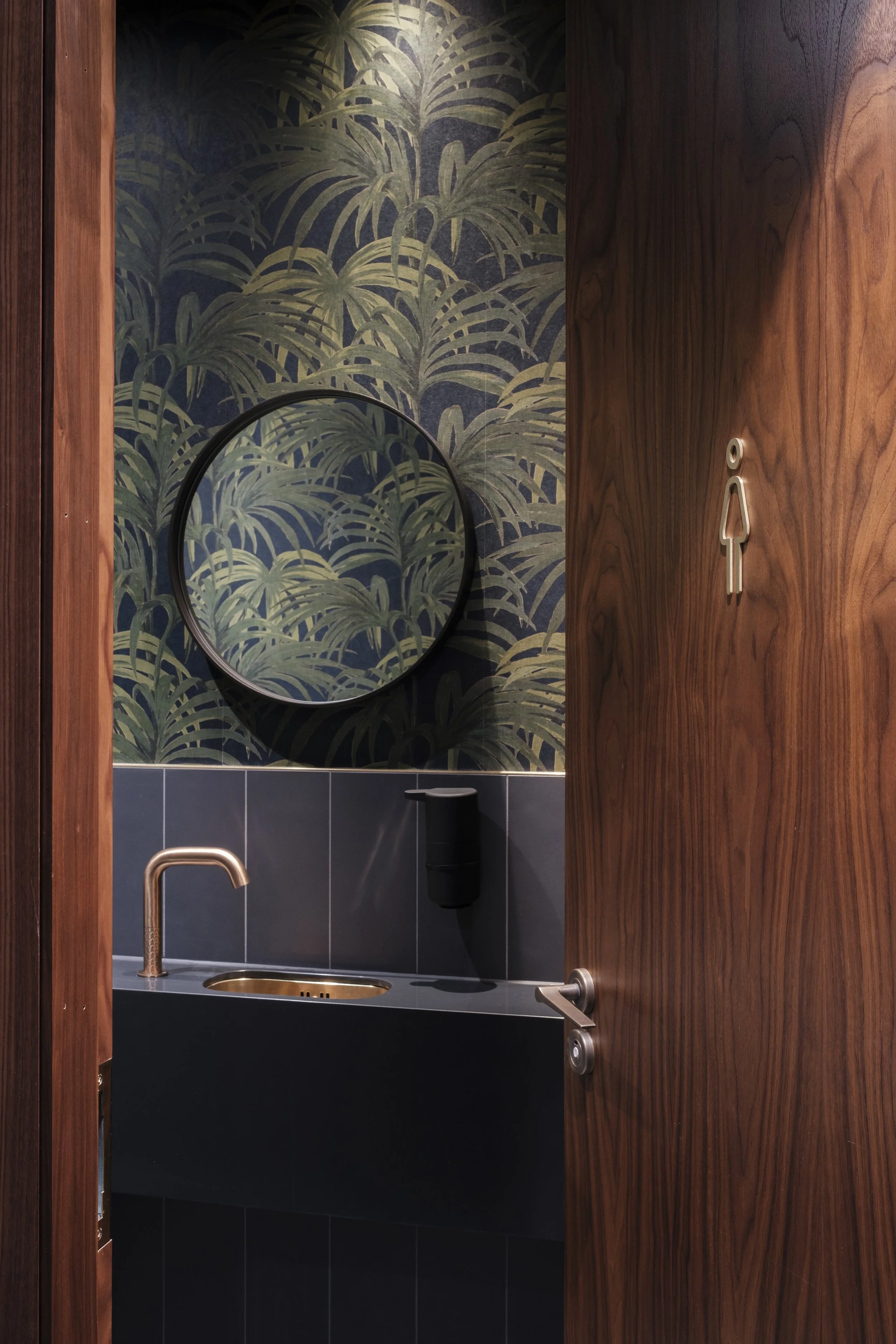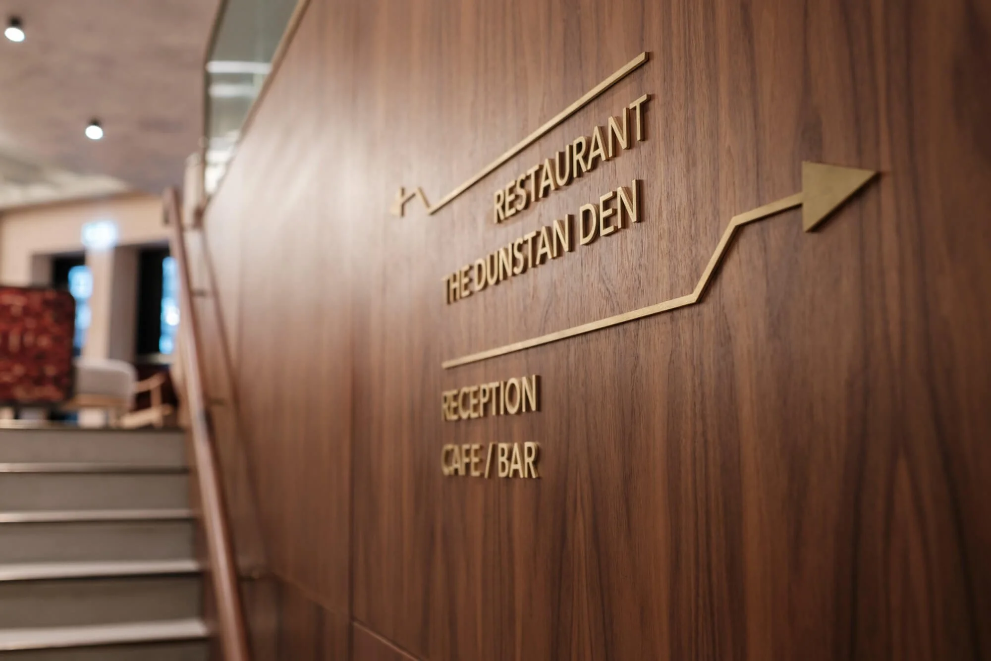 The materials used for the signage remind you of the mechanical side of its textile inspiration. Brushed brass, antique copper and weathered steel were used through both the internal signage and the wayfinding. Marrying these with rustic hardwood and the muted colours of the soft furnishings create an industrial elegance to the space.