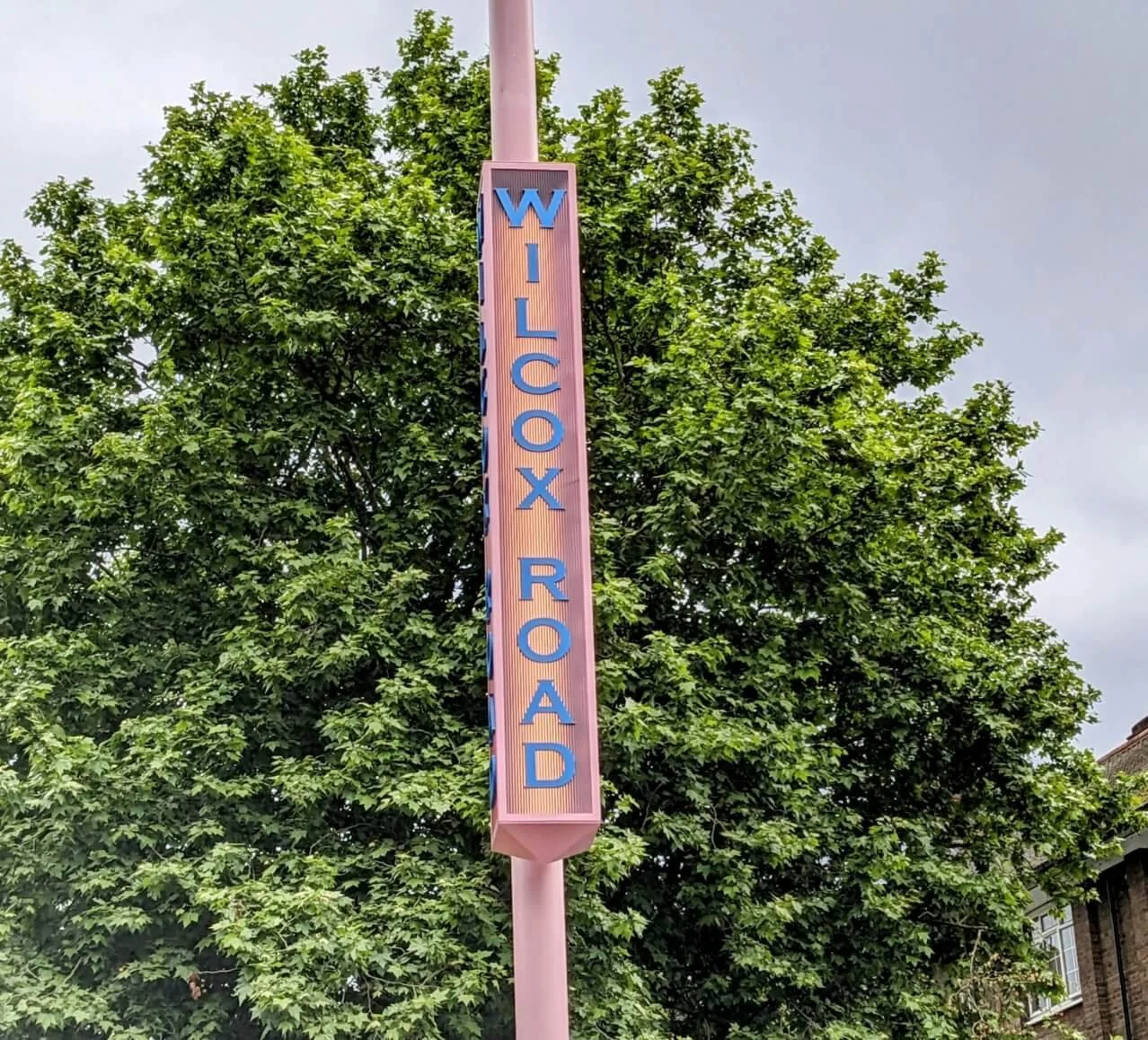 A striking fabricated steel square projecting road sign, 2.34m high x 0.32m wide, dominates one of the pink-painted lamp posts on Wilcox Road.